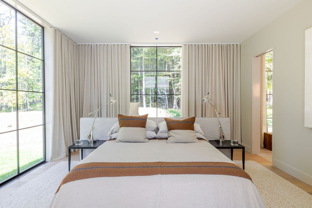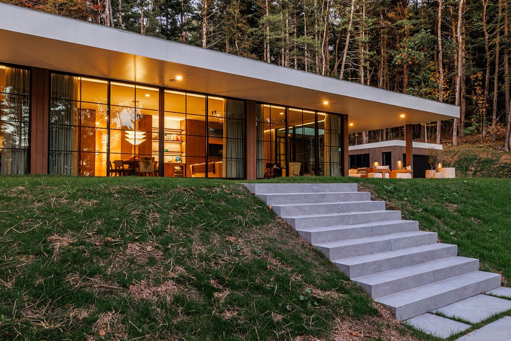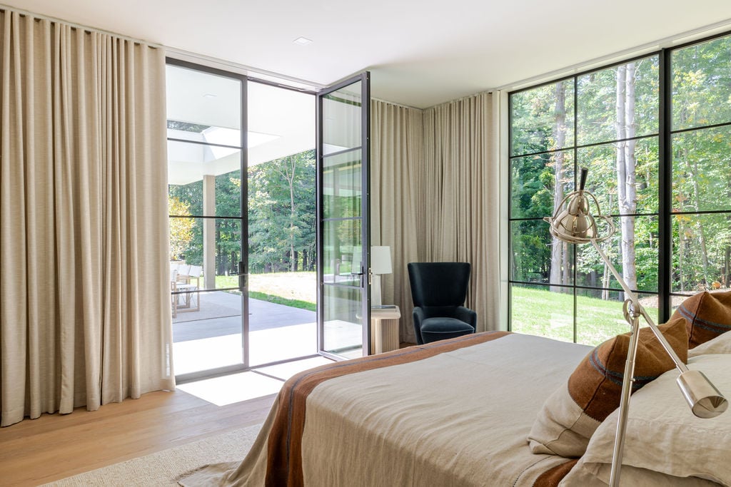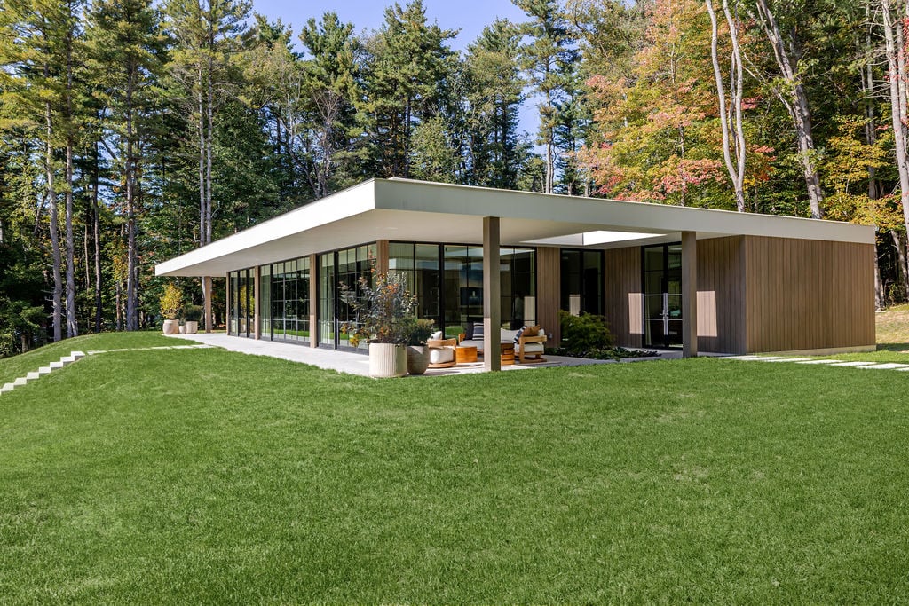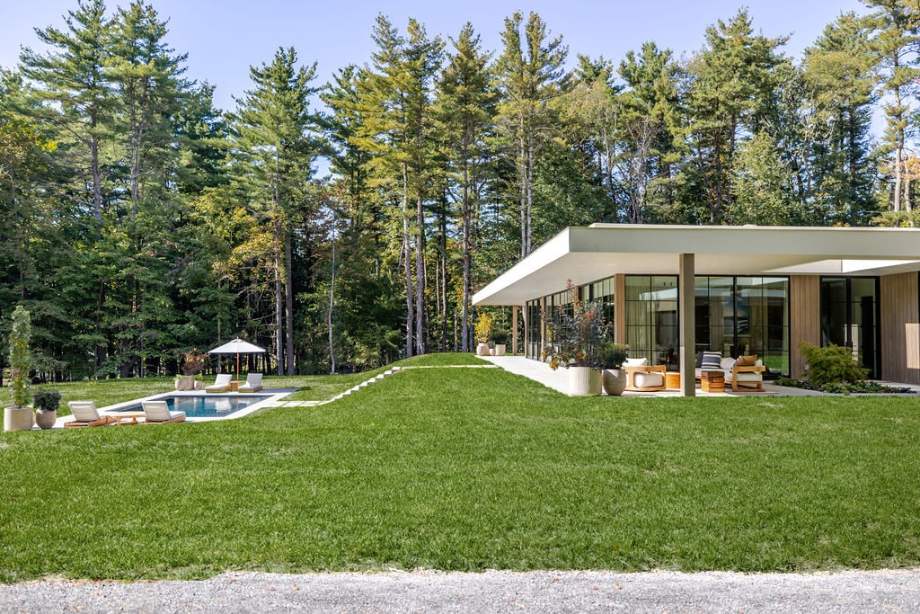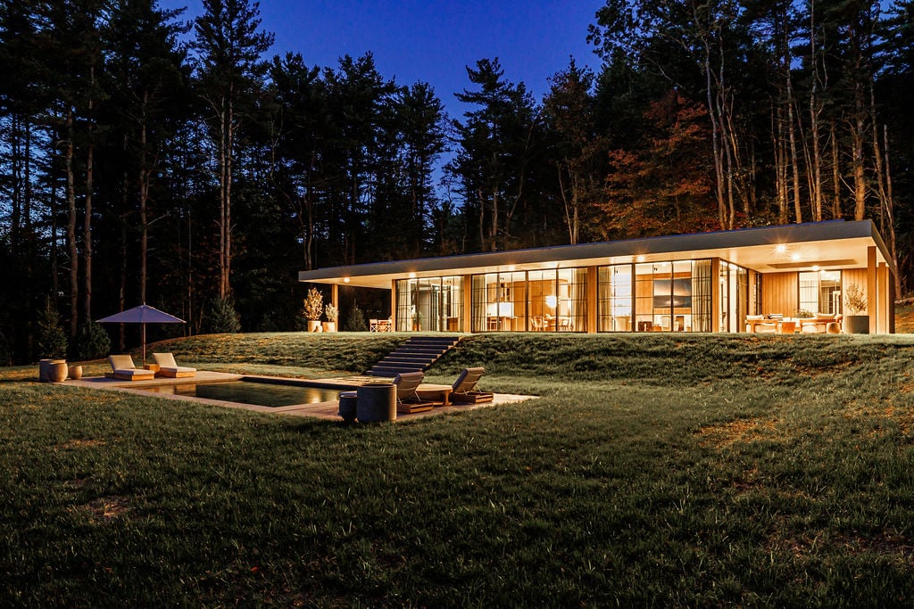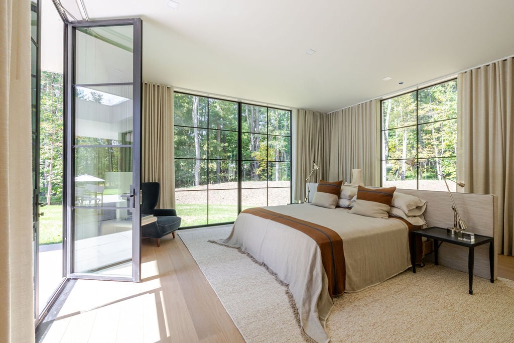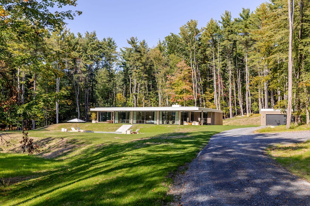 Located in the private, gated enclave of The Ridge at Copake Lake. This newly built modern glass home offers single-level living on 4 secluded acres. Designed for an indoor/outdoor lifestyle, the main level features 4 bedrooms, 3.5 bathrooms, and a great room with a custom millwork kitchen, large breakfast bar, and floor-to-ceiling glass for seamless connection to the outdoors. The lower level is finished for use as a media room, guest room, game room or additional entertaining space. There is also a 4th full bathroom and an incredible amount of additional storage. A gunite pool and detached 2-car garage complete the offering. Sold fully furnished, including a fully equipped kitchen and high-quality linens. It is truly move-in ready. Enjoy access to a private 99-ft waterfront with an individually appointed boat slip.